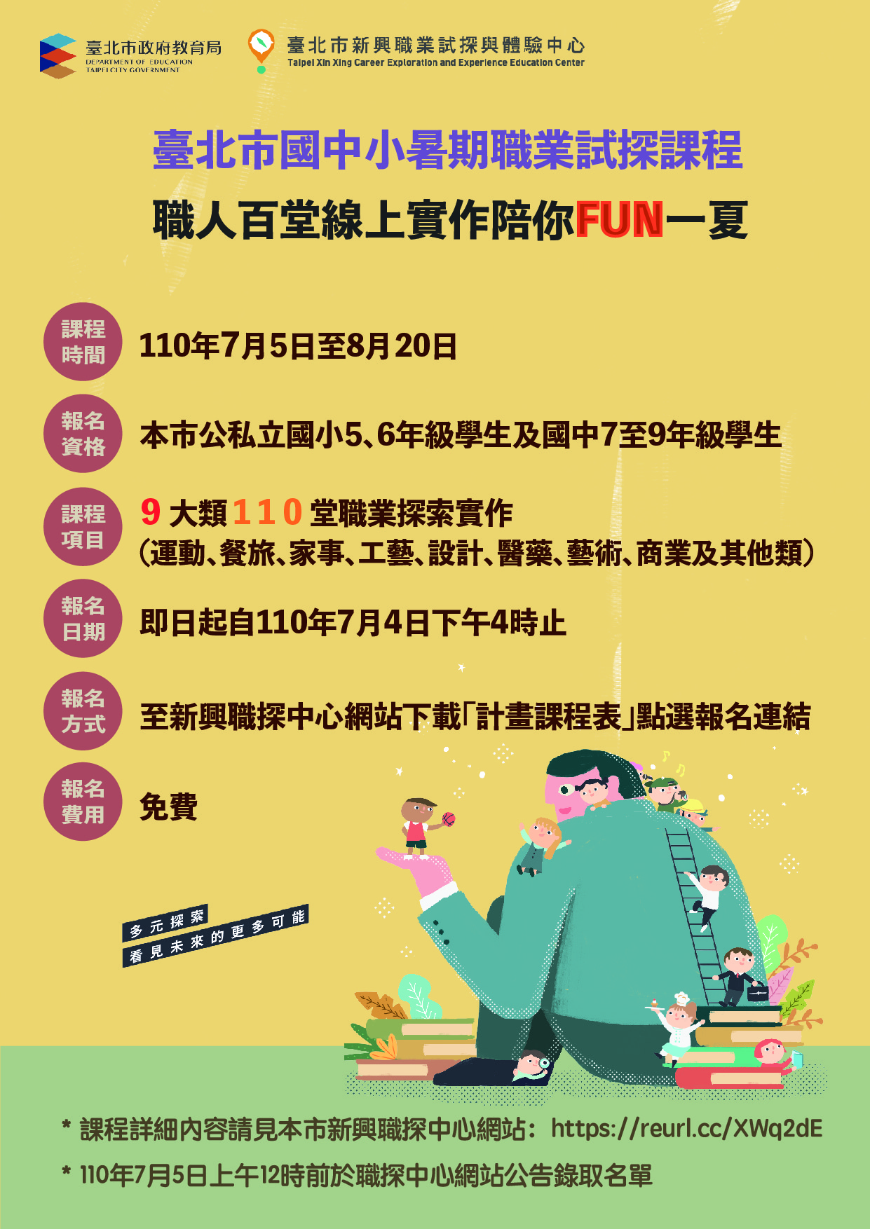 (三)報名方式:點選課程附表連結填寫Google 表單進行報名。倘報名人數超過課程人數上限,將進行亂數抽籤,並於110 年7 月5 日(星期一)中午12 時前於本市新興職業試探與體驗示範中心網站( https://ftt.tw/0S04d )公告錄取名單。